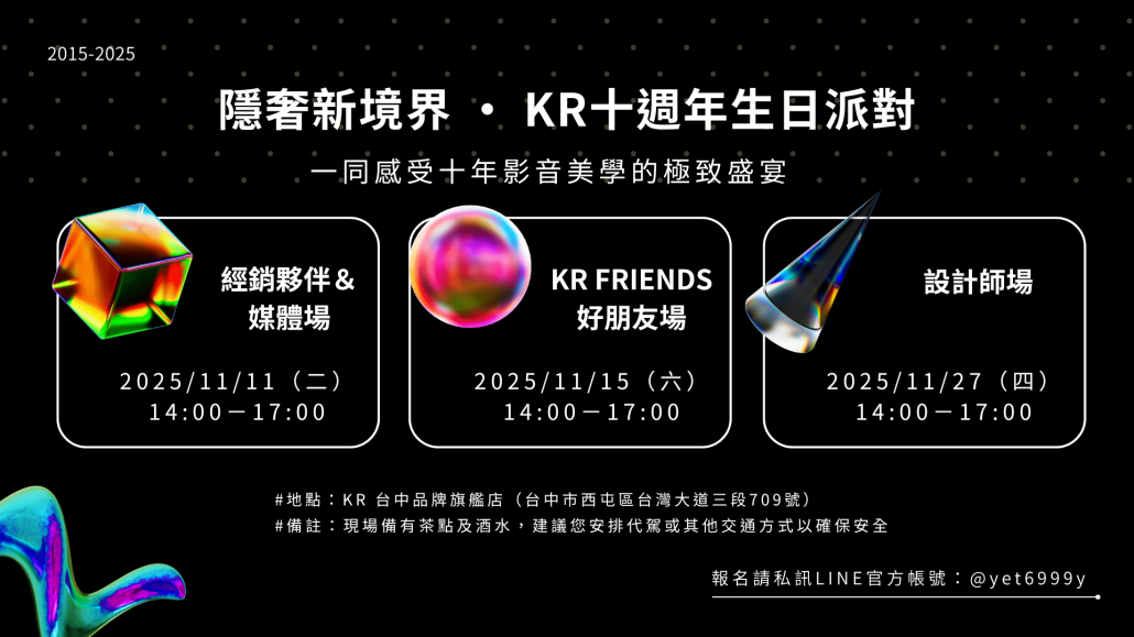 KR表示:「十年,是成長的里程碑,更是嶄新的開始。我們希望透過這場活動,分享對影音、設計與生活美學的熱愛,並邀請所有夥伴與媒體朋友一同見證KR邁向下一個十年的隱奢旅程。」